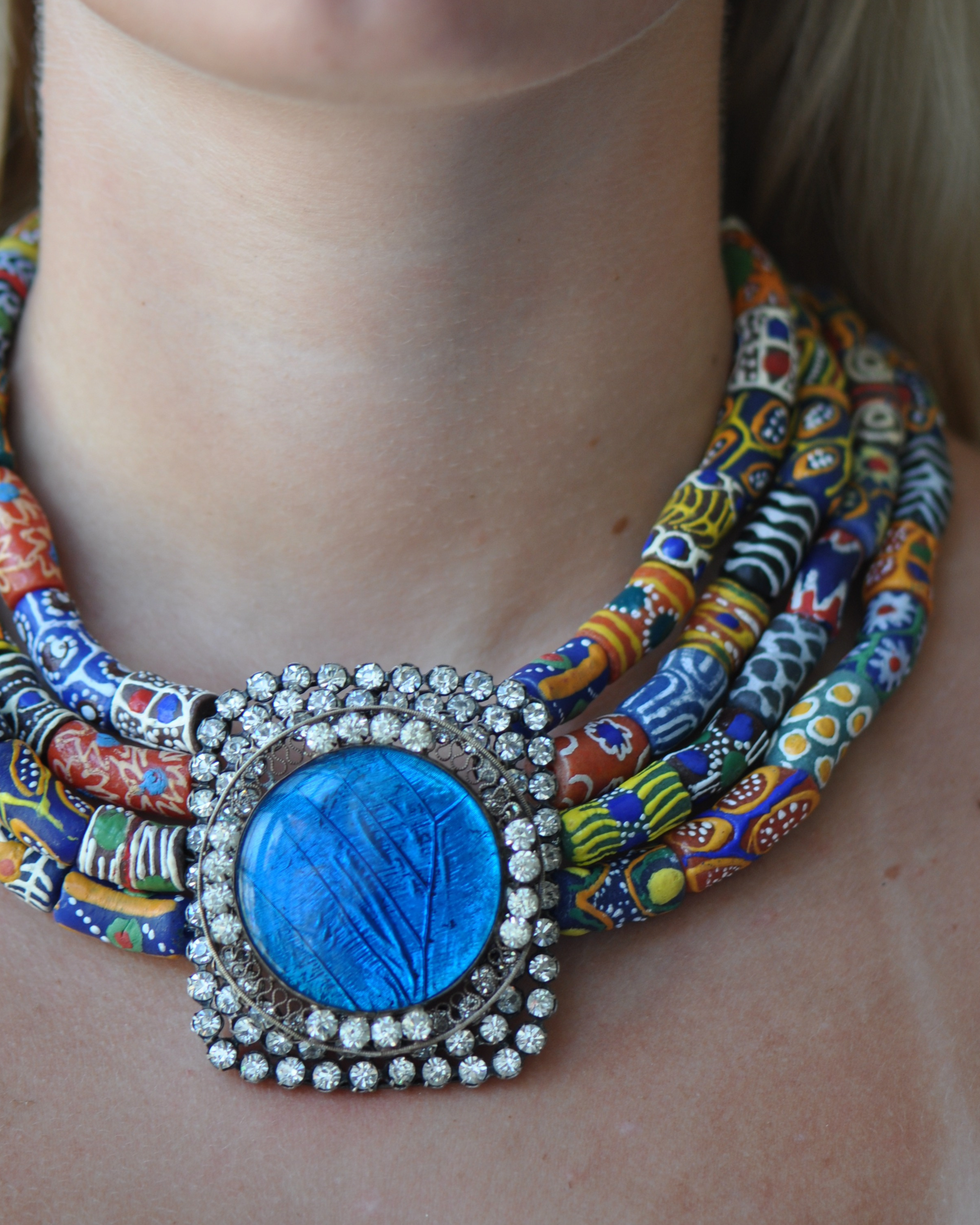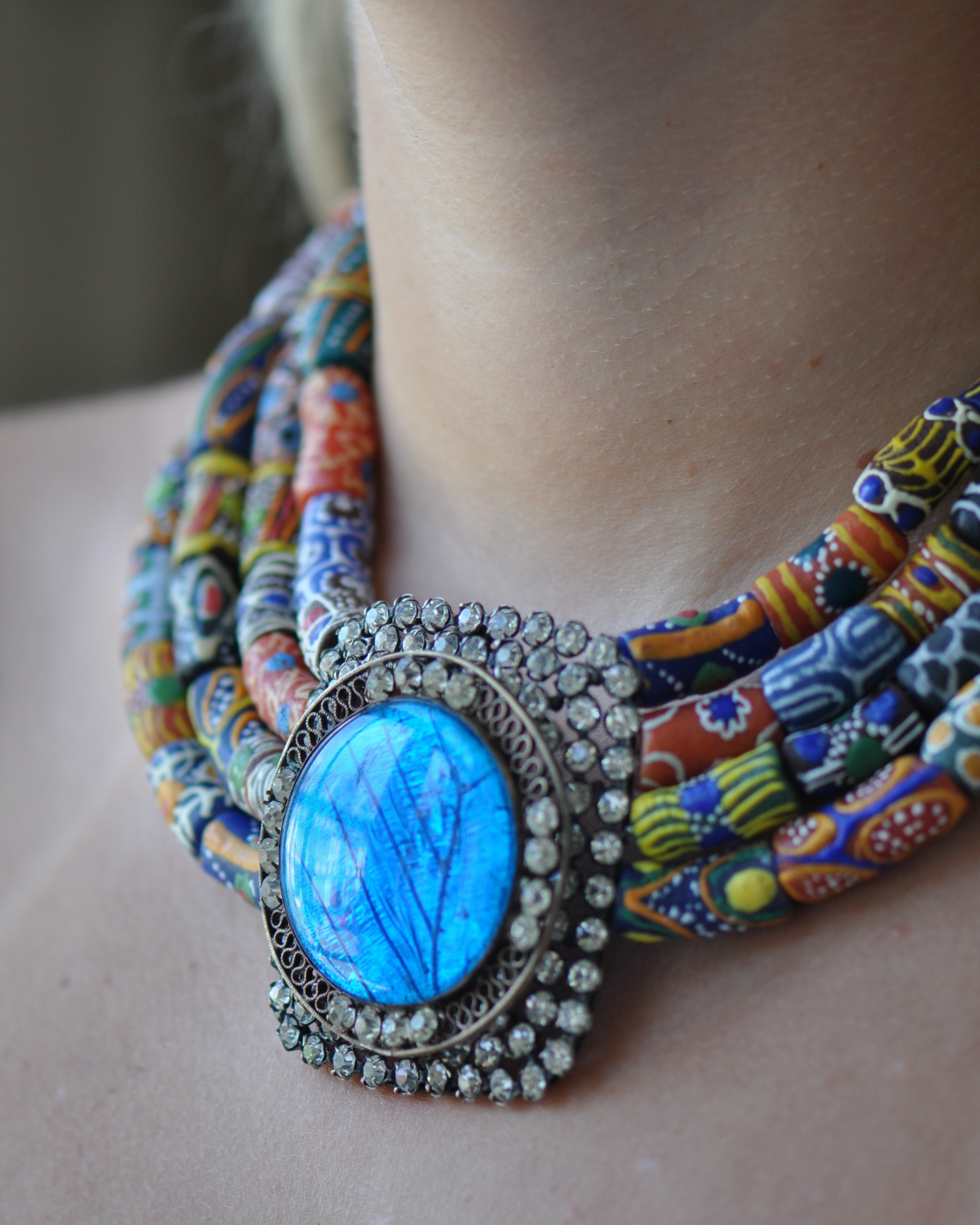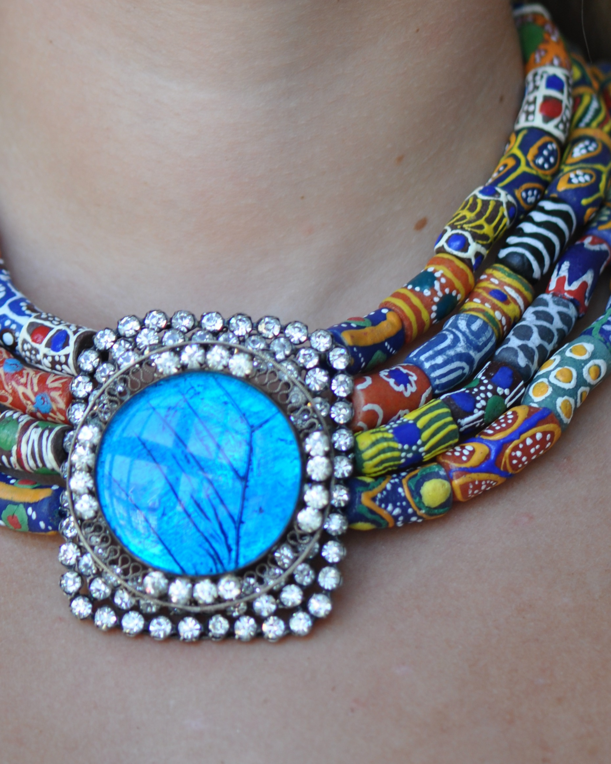 This Africana inspired necklace has been created using hand painted beads made of recycled glass, they are a modern interpretation of traditional bead work done by the Kobe tribe of Ghana. It is adorned with a Vintage brooch with vibrant blue center.