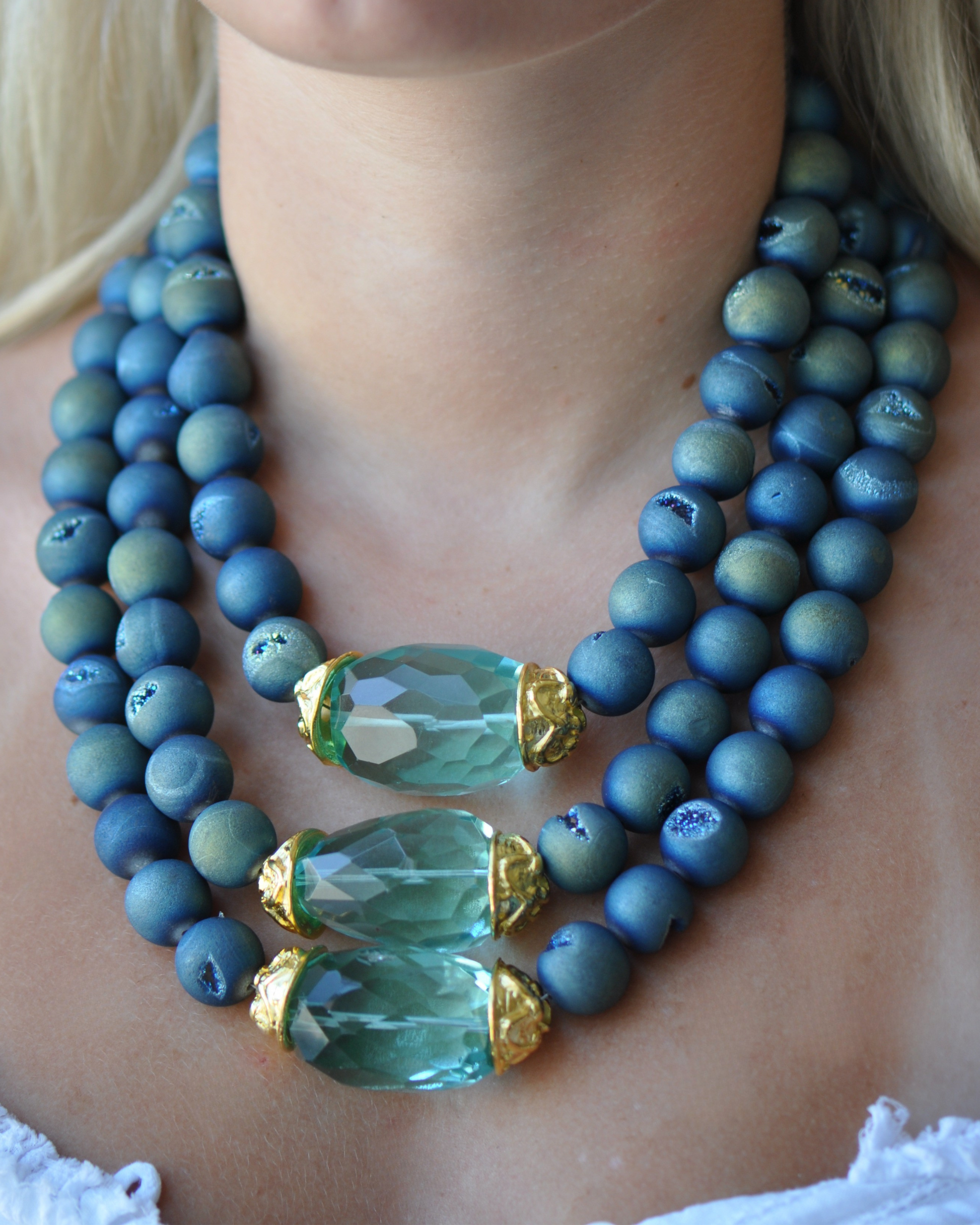 Featuring three rows of teal and gold-toned quartz beads, finished with three large heated aquamarine quartz stones.