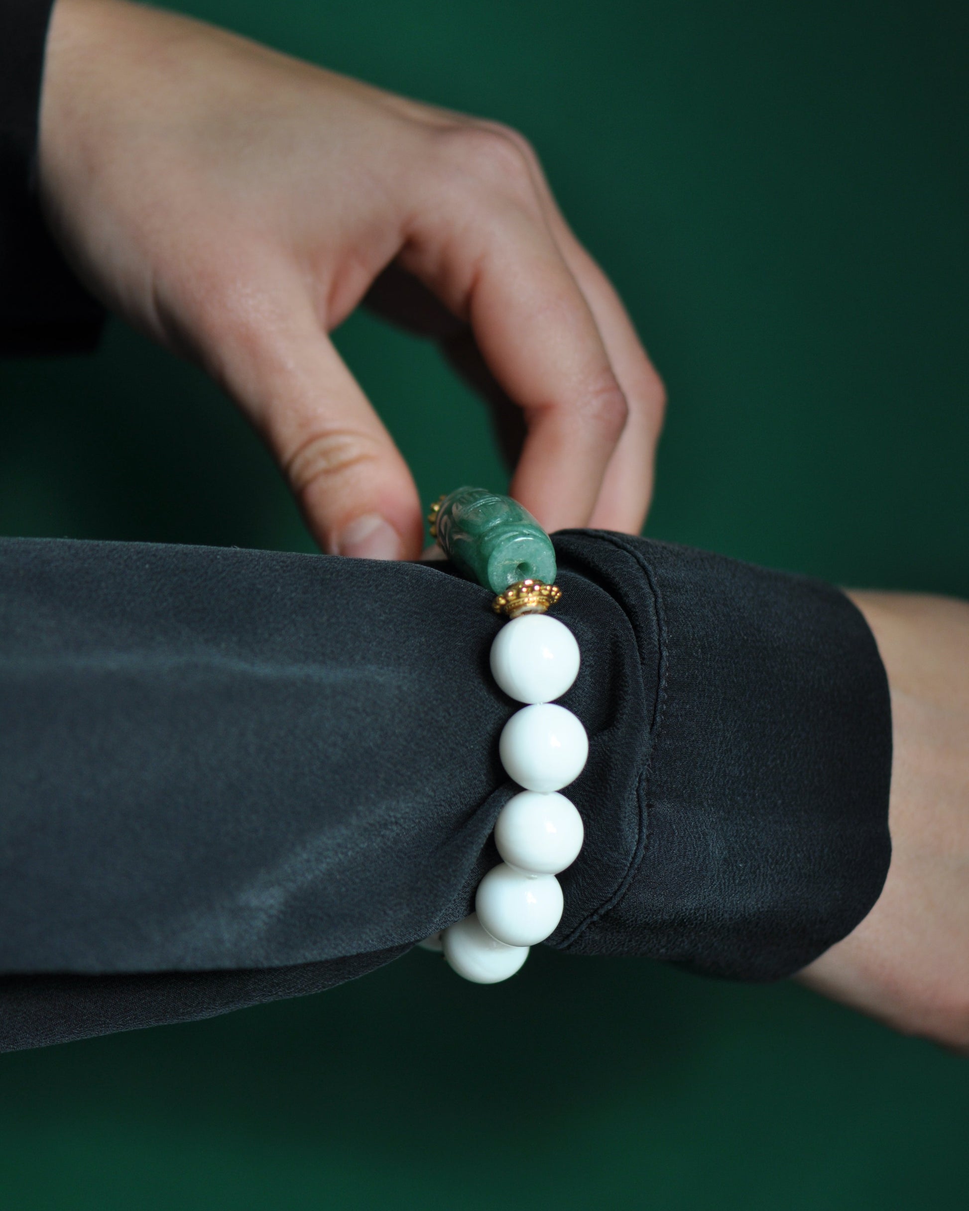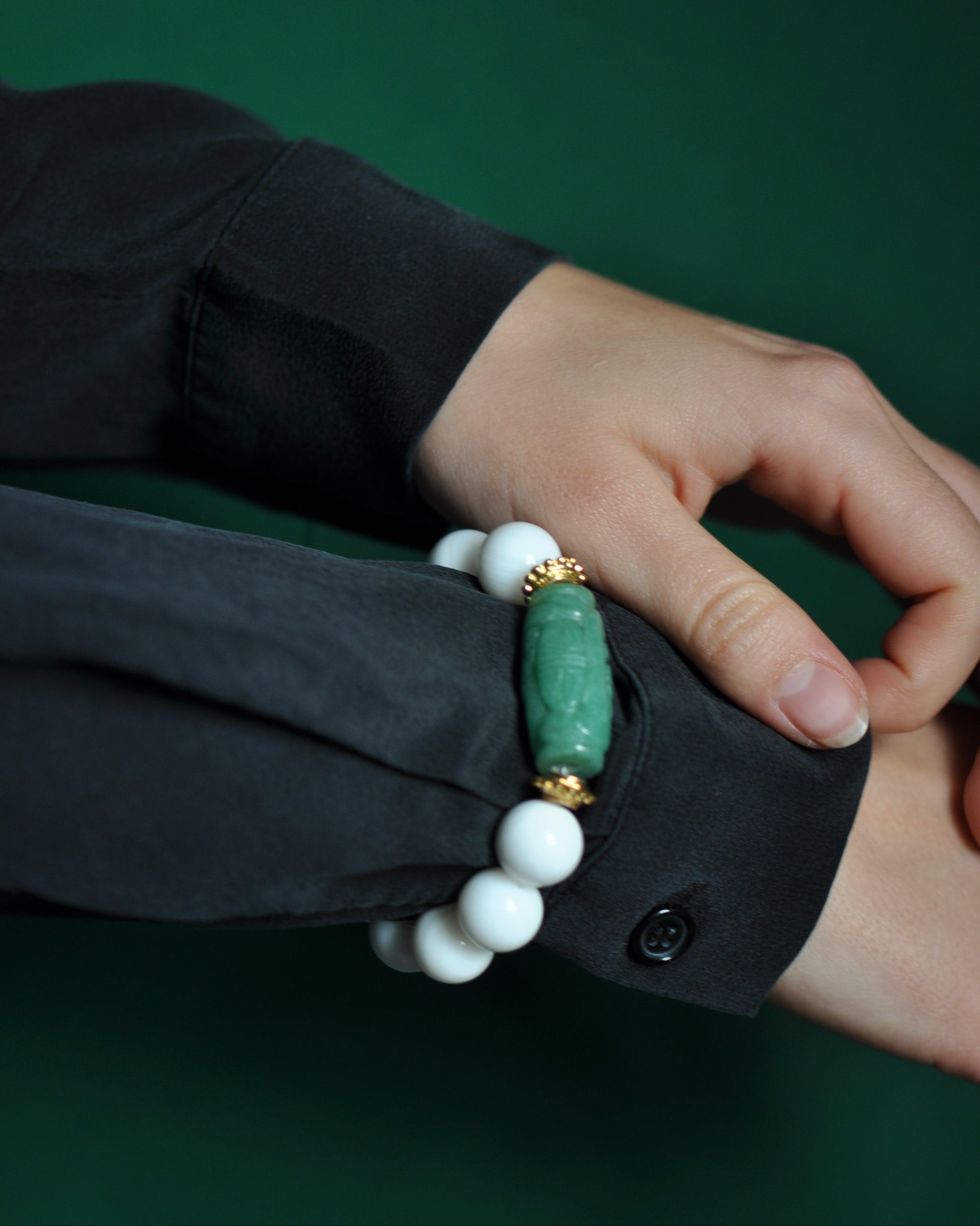 Bracelets accented with a carved green jade stone centre piece, and gold-plated detailing.