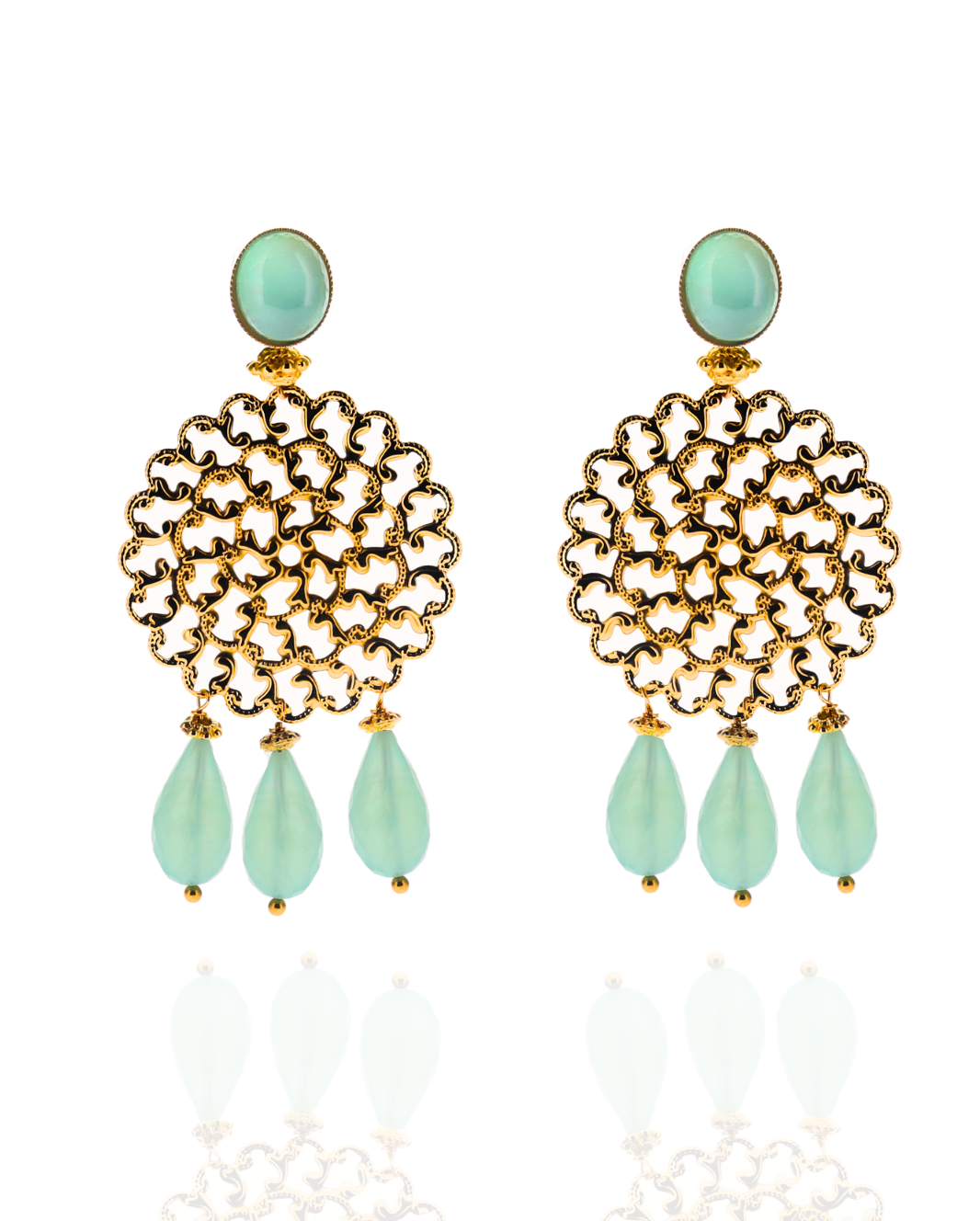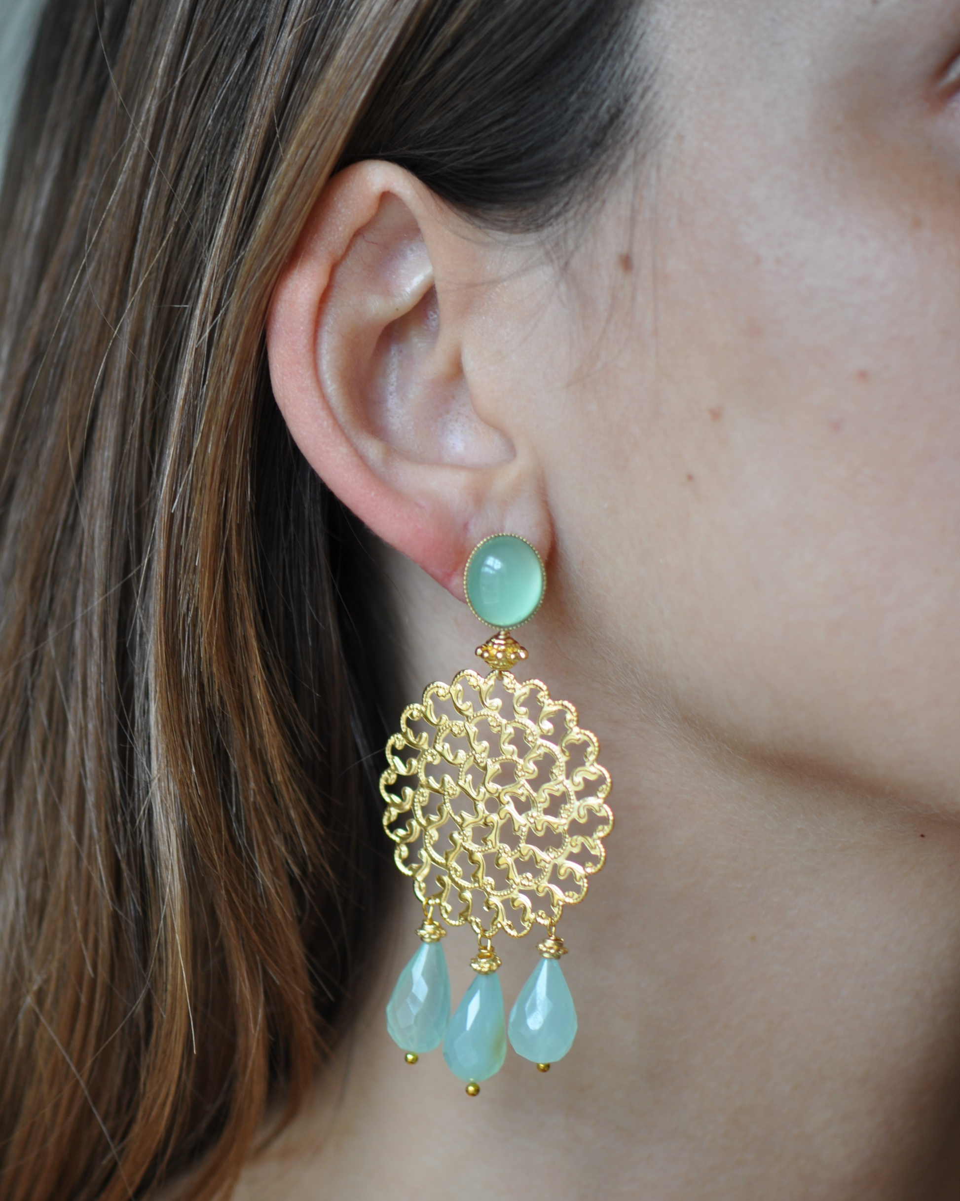 These statement earrings combine a gold filigree circle with delicate green agate drops, adding a touch of boho chic to your luxury wardrobe.