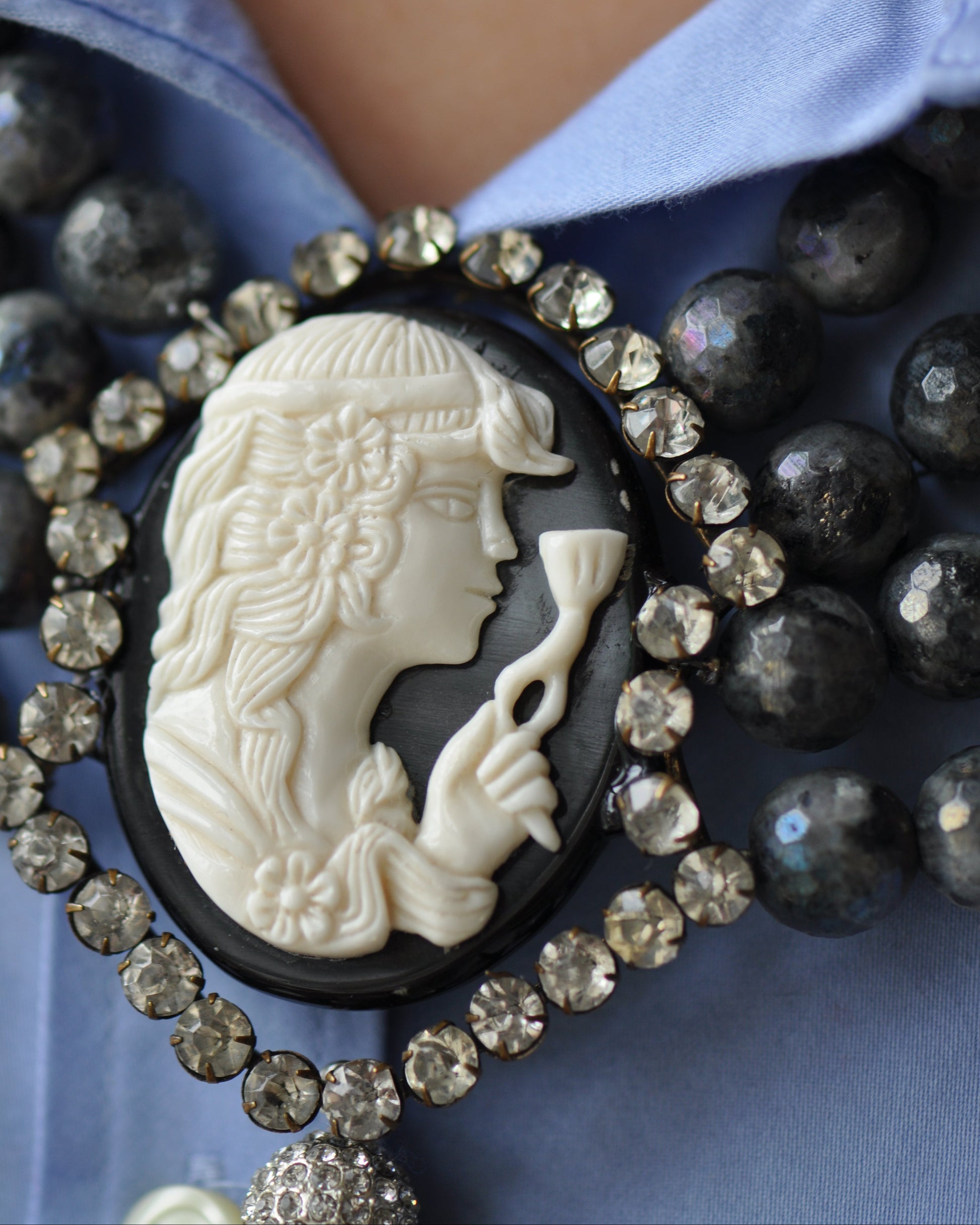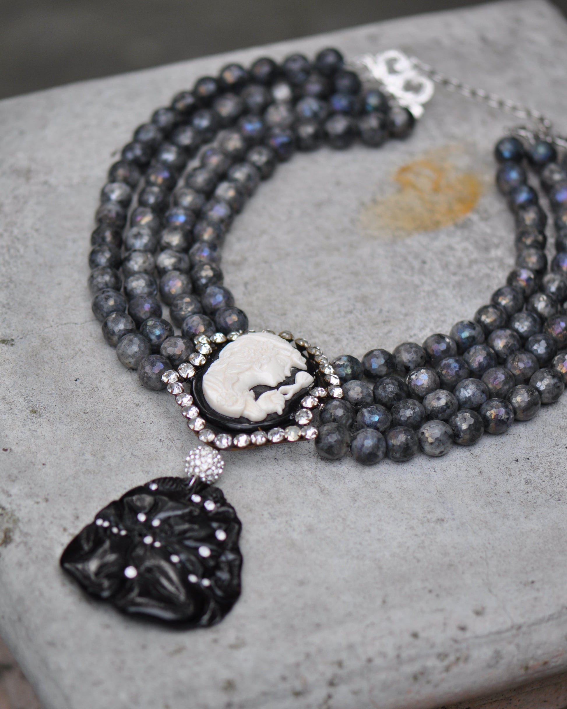 A beaded necklace with a Mother of Pearl centrepiece and an elegant onyx drop.