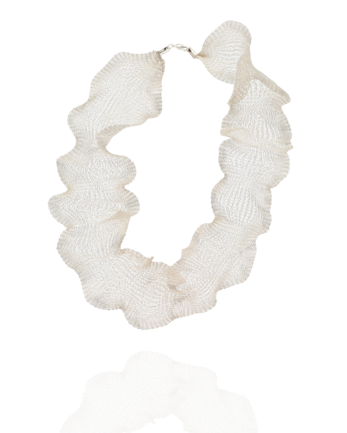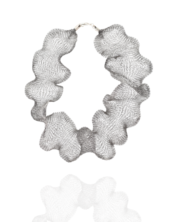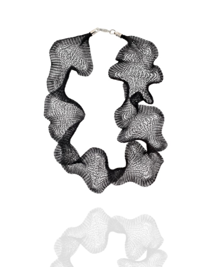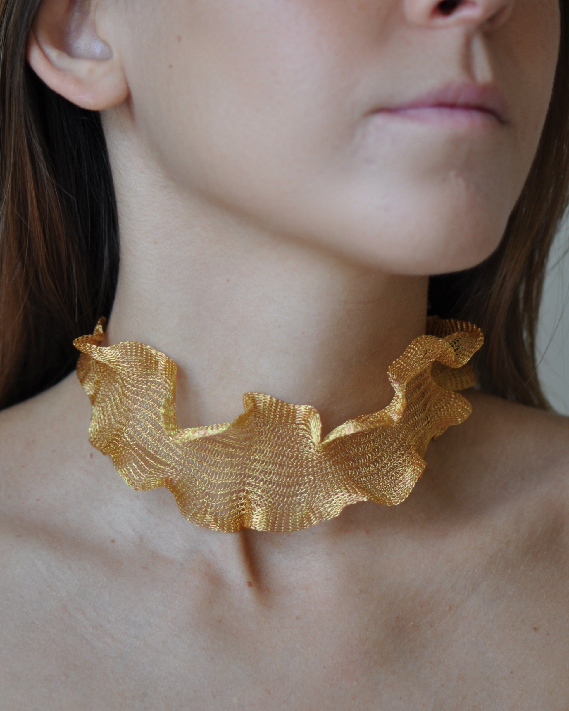 The Cosette Choker is a light yet structural piece by Laurence Coste, handcrafted in our London atelier from gold silver, blue & black mesh. Click below to add this piece to your basket.