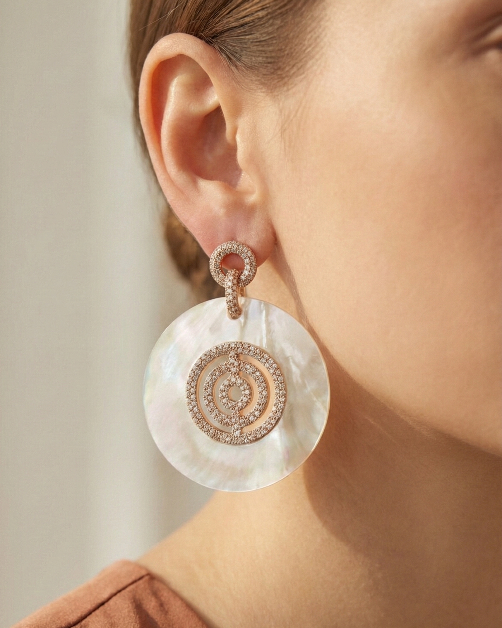 Mother-of-pearl drops, embellished with shimmering pavé detailing. Available in 3 sizes.