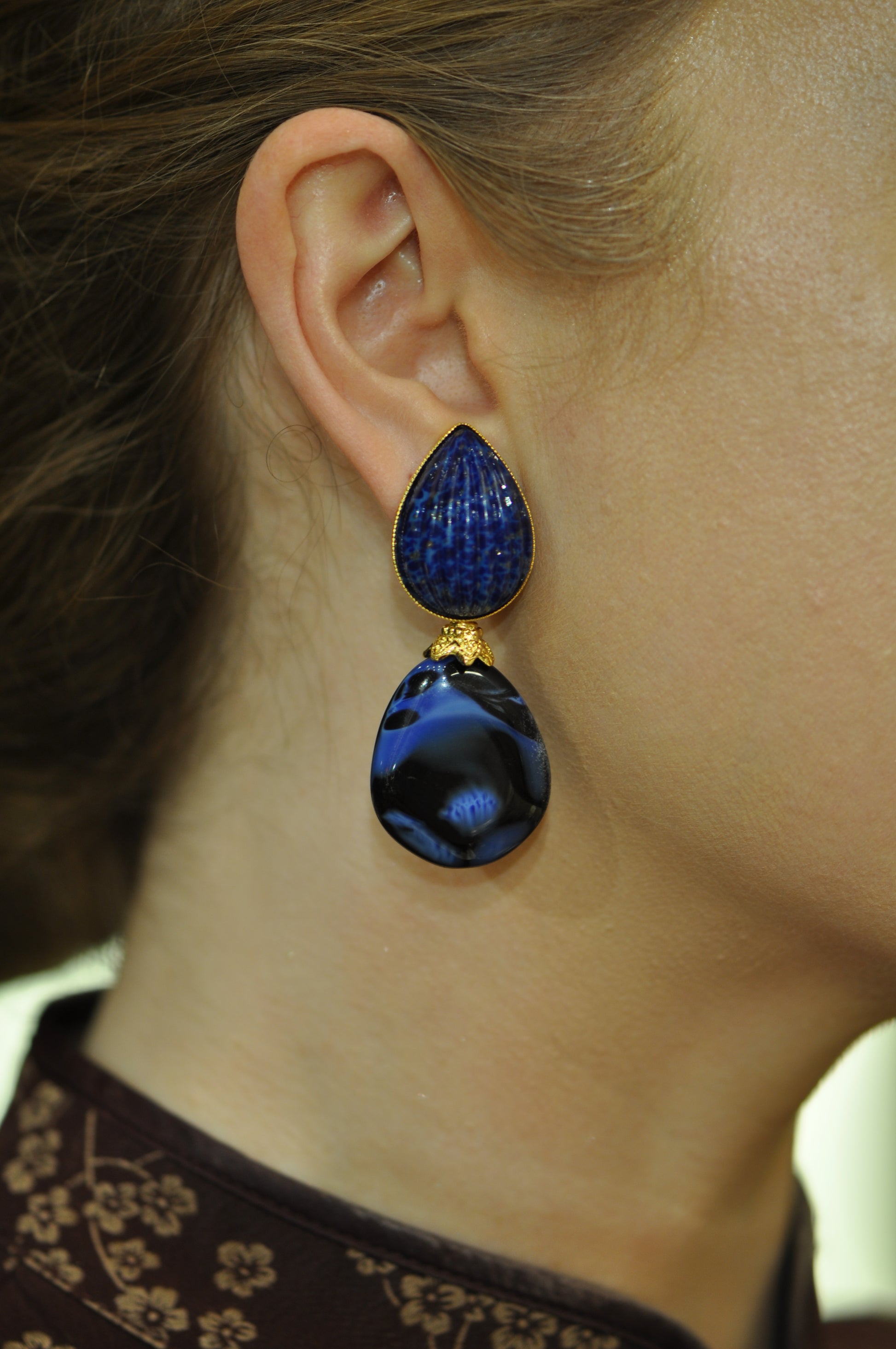 Discover the Layana Earrings, a fusion of classic Lalique-style sophistication and contemporary charm. These earrings feature a lapis lazuli top in a rich, royal blue shade, and marble drop, which combines black and blue to create a striking marbling effect.