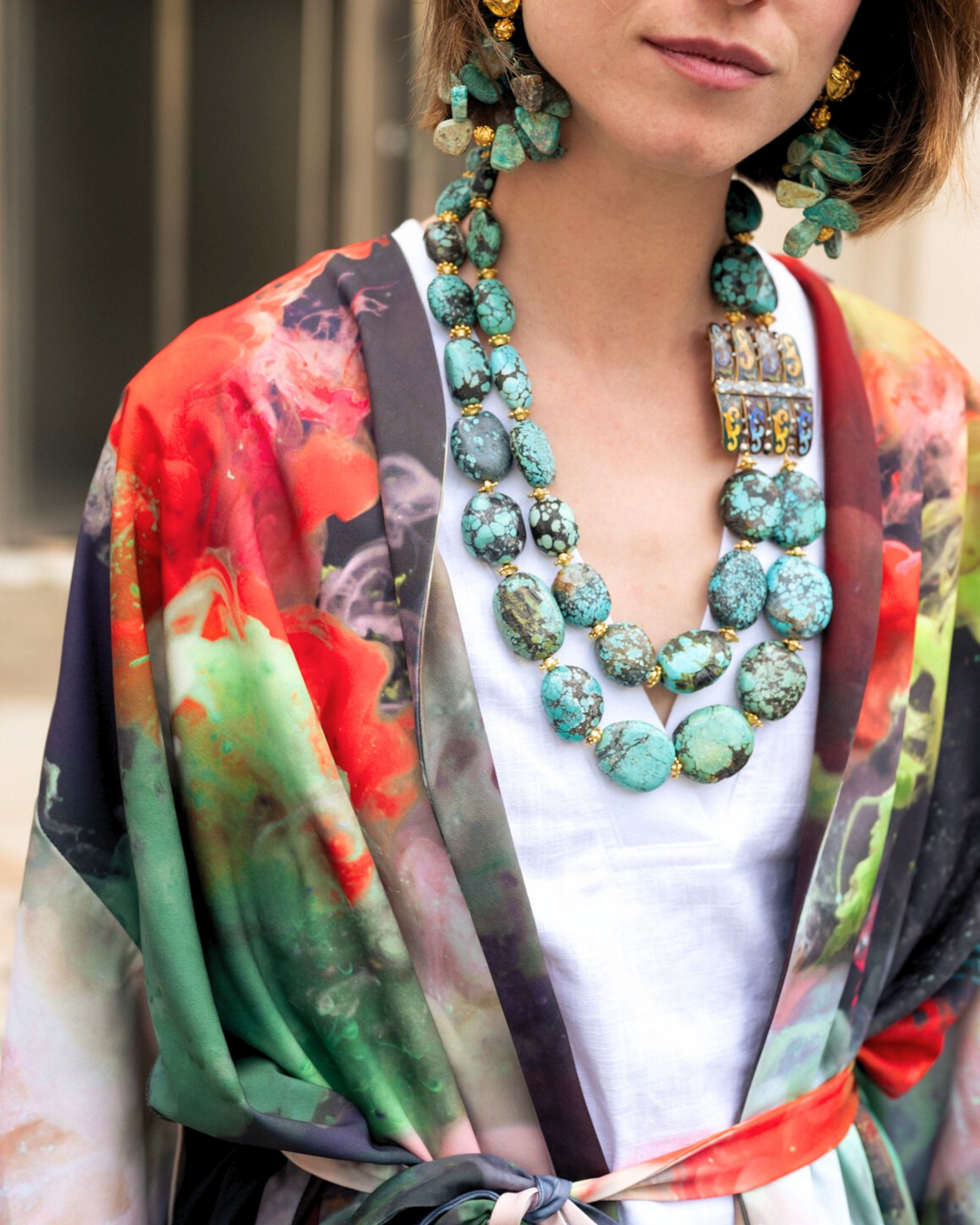 This necklace is one of a kind and comprises two strands of stunningly curated marbled turquoise stones with a vintage brooch.