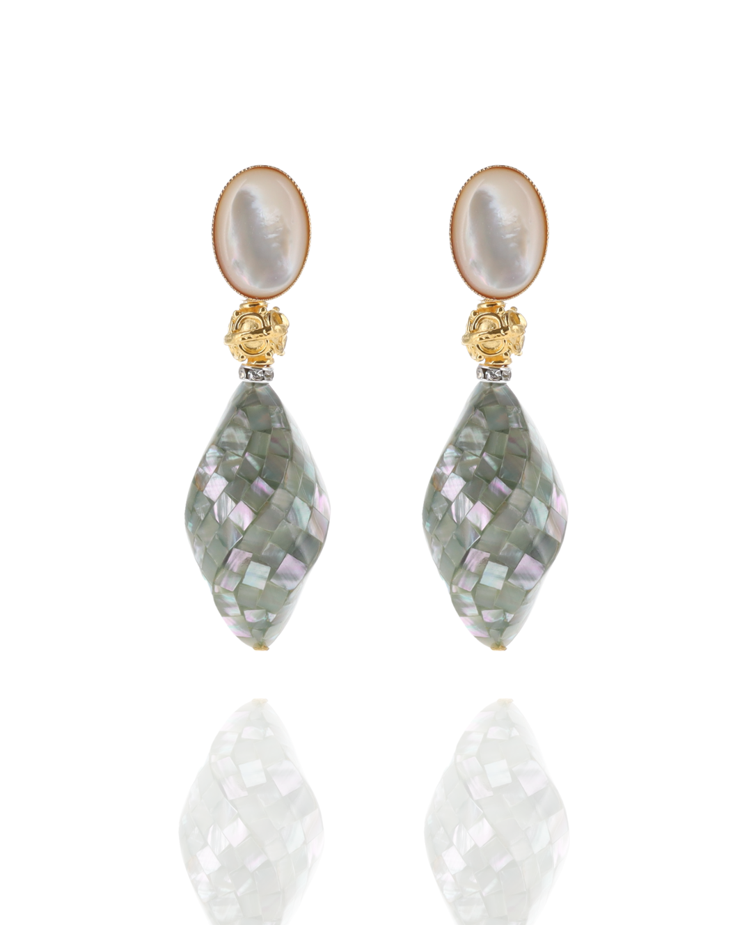 These stunning earrings, offered in two soft shades of taupe & grey chequered Mother of Pearl in twisted drop complimented with a Mother of Pearl oval top