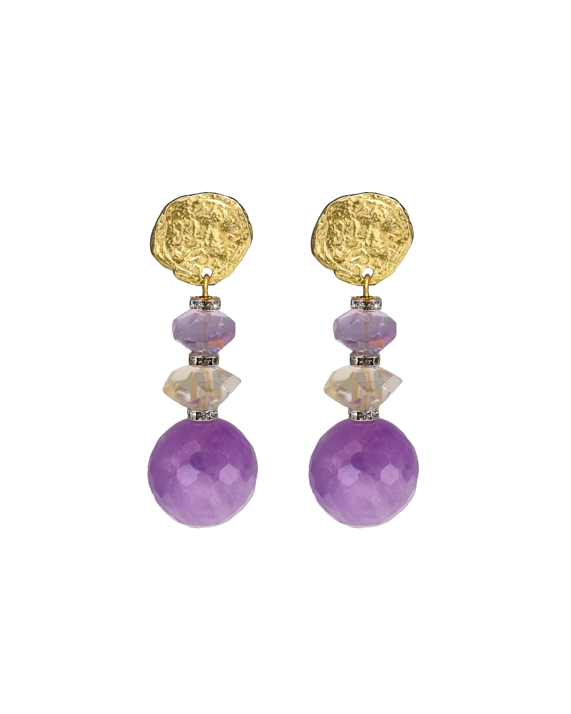 The Tonia Earrings blend beautiful Amethyst drops with your choice of a striking mixed marbled mauve oval or gold coin top.