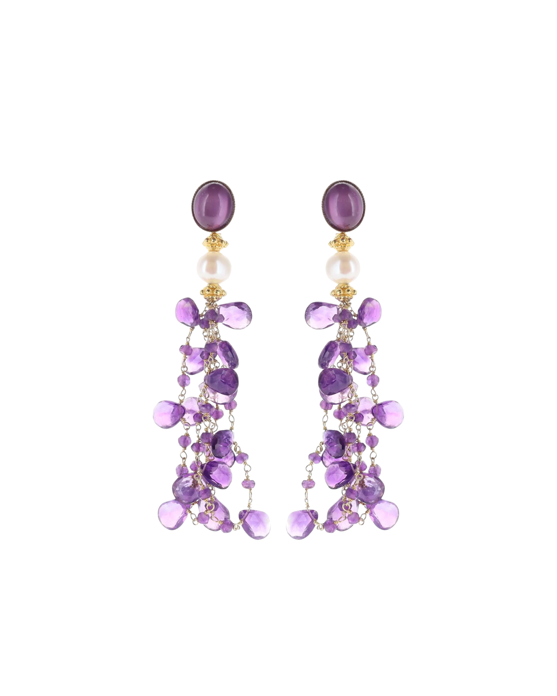 Chantelle Earrings – a stunning blend of purple amethysts and a captivating purple glass top. Meticulously crafted for modern sophistication and timeless charm, these earrings boast royal purple hues that create a unique visual appeal. With graceful movement and a touch of mystique, they're perfect for any occasion.