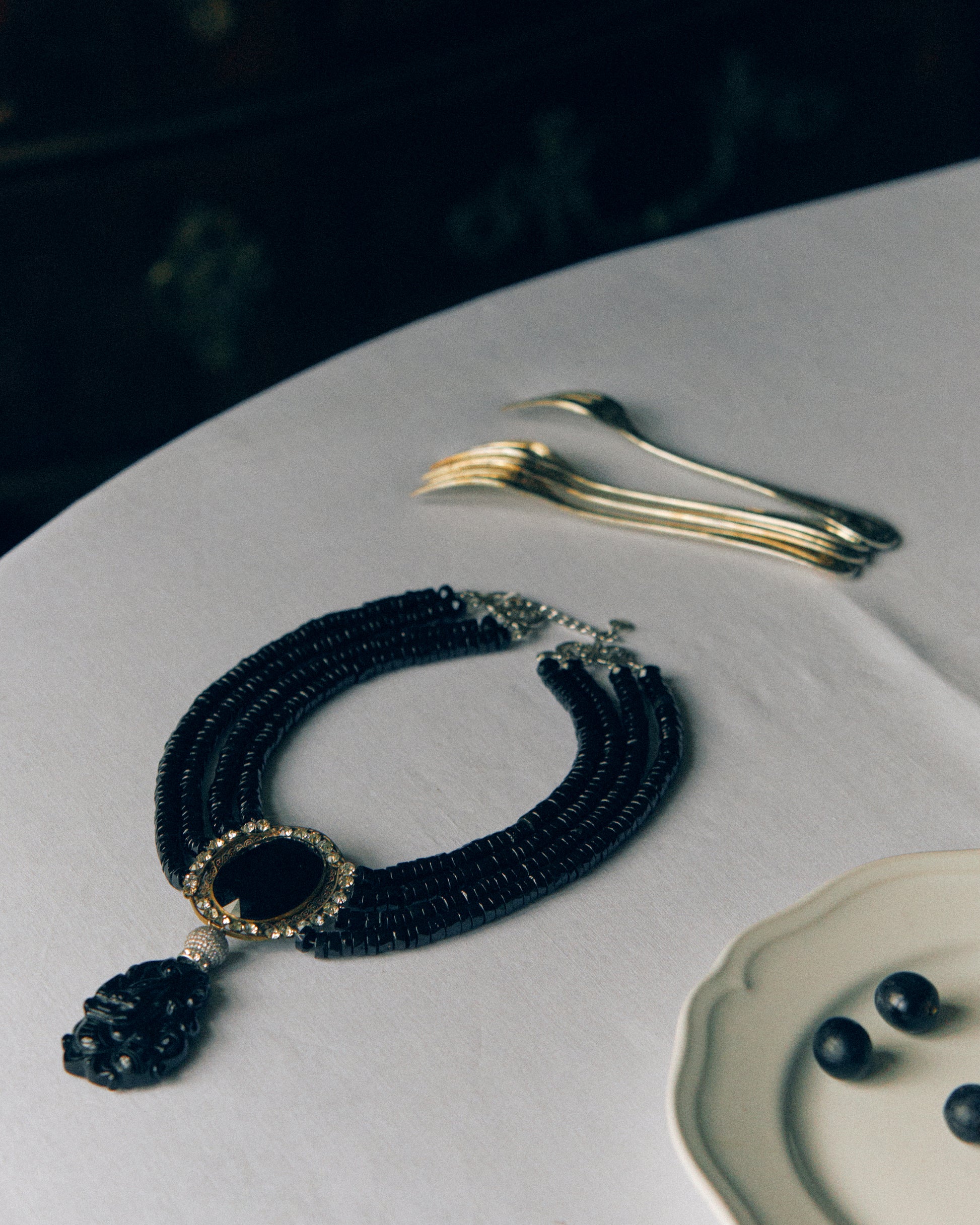 Introducing the Athena Necklace, featuring four strands of black onyx beads with a black onyx and cubic zirconia centre, finished with a large mother of pearl pendant.