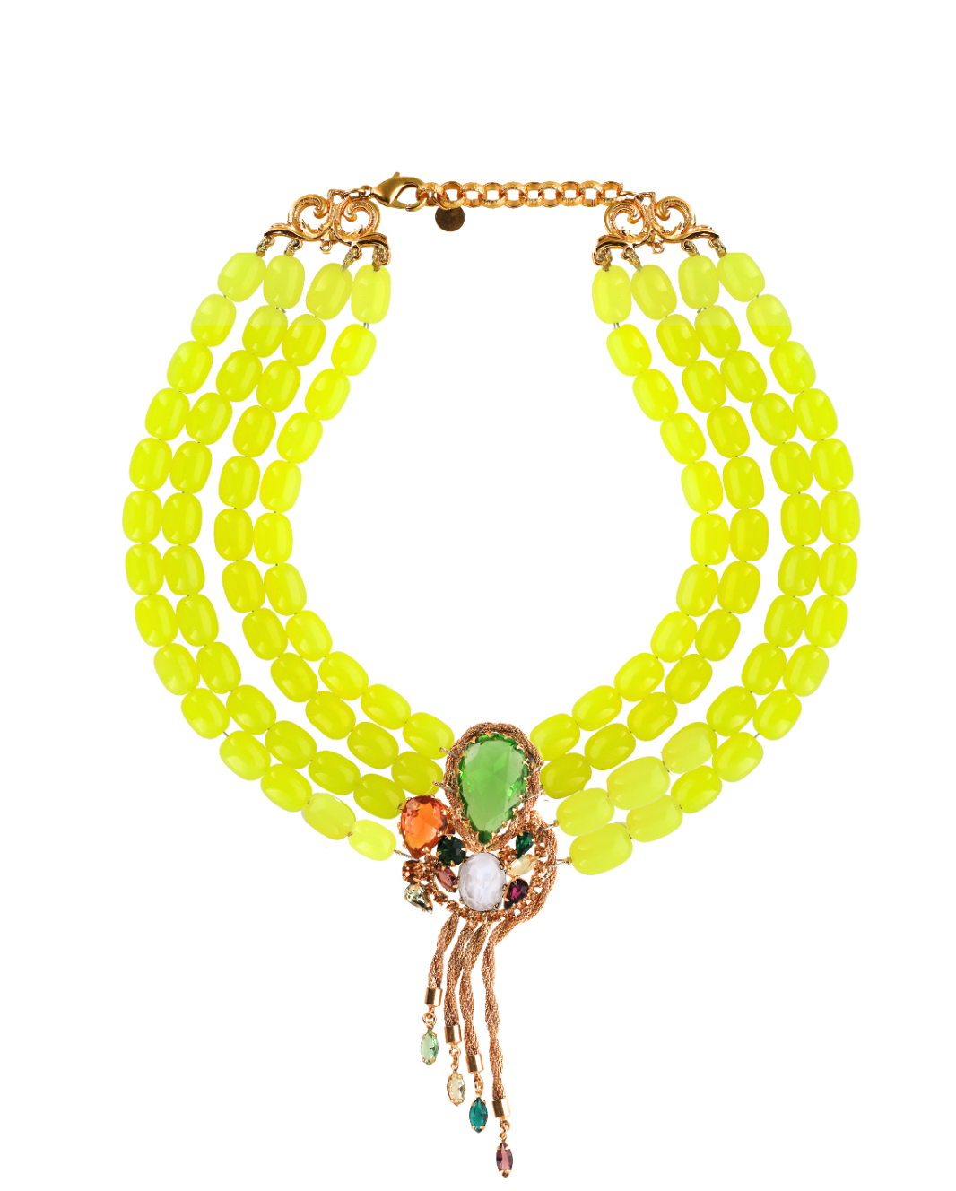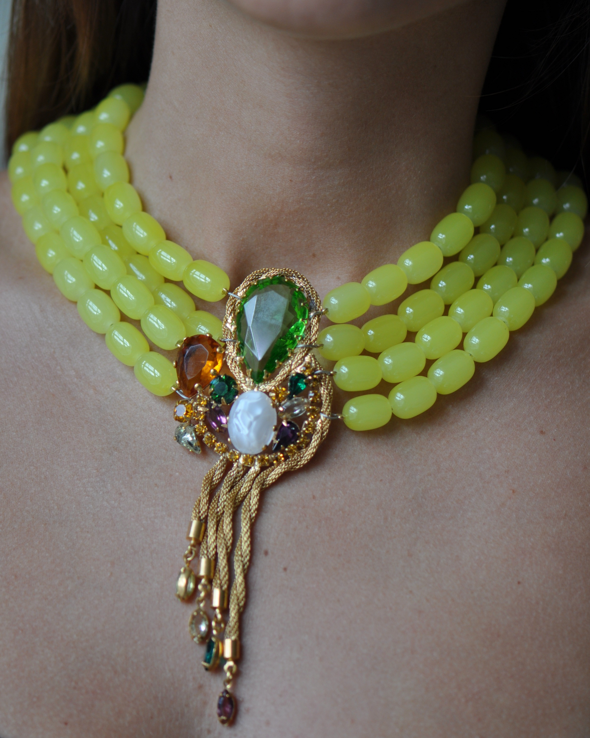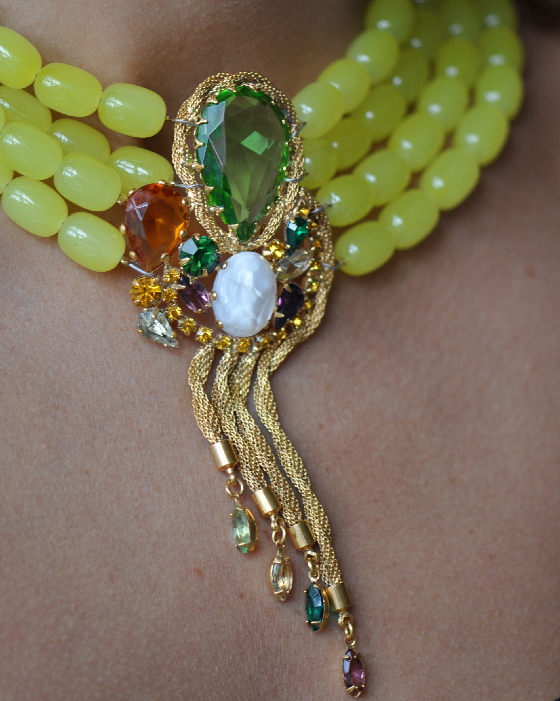 This necklace featuring four strand of bright yellow murano glass beads with a large brooch with semi-precious stones framed in ornate gold-tone caps.