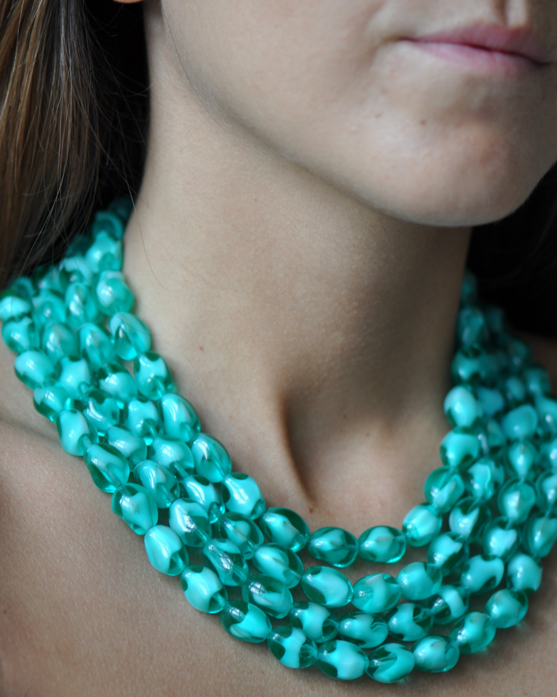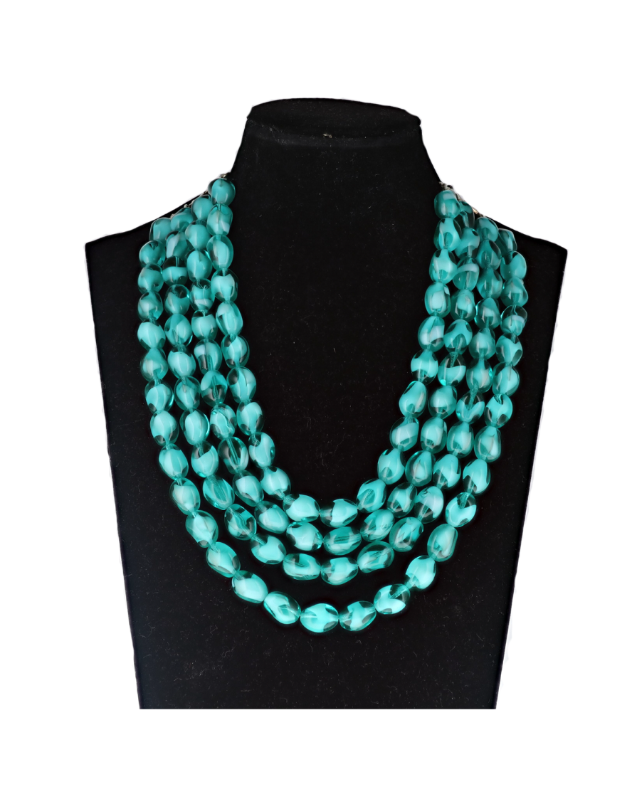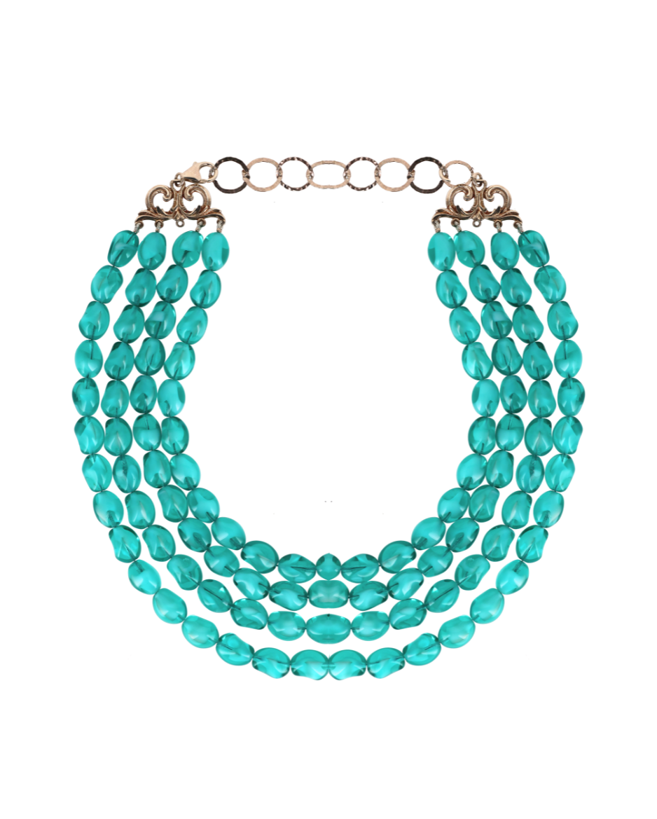 A four-strand necklace crafted from bright turquoise Murano glass beads. Light-catching and luminous, this piece channels the refreshing energy of coastal waters.