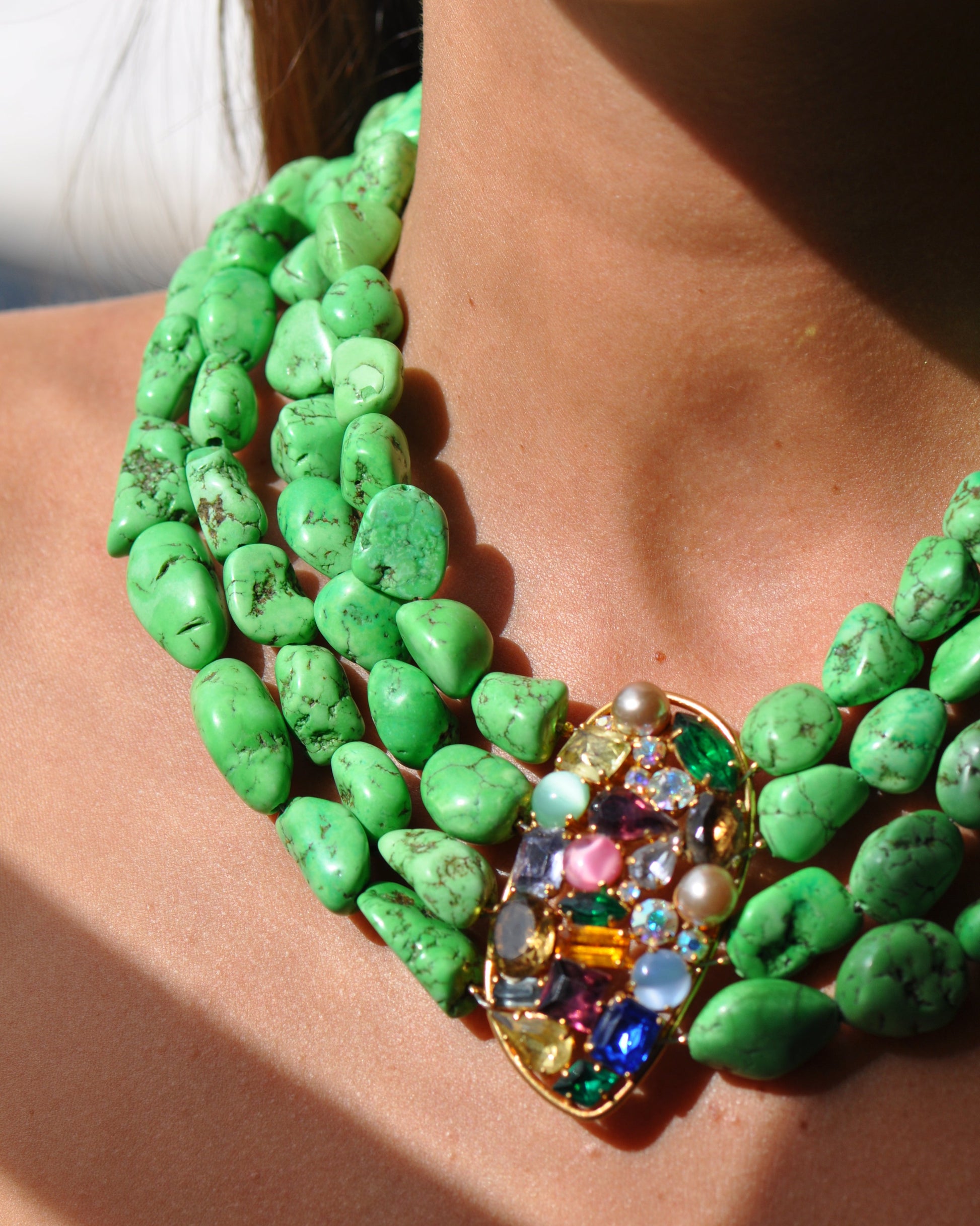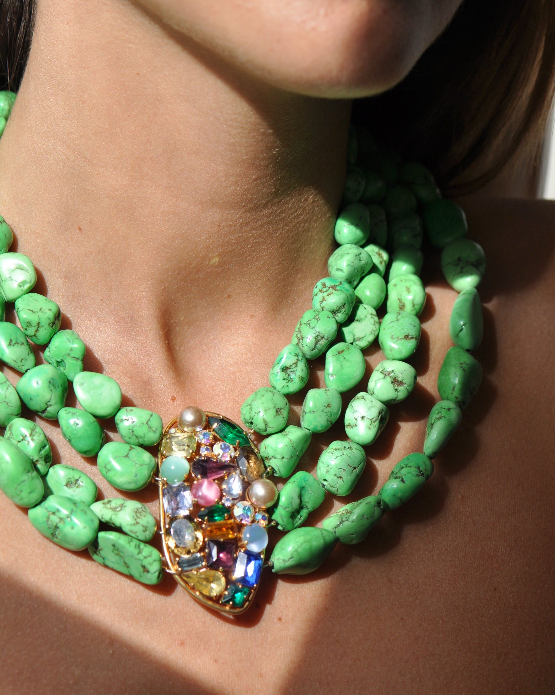 The Natalie Necklace features four strands of polished apple green turquoise nuggets, centred by a vintage gold-plated brooch set with semi-precious stones and pearls.