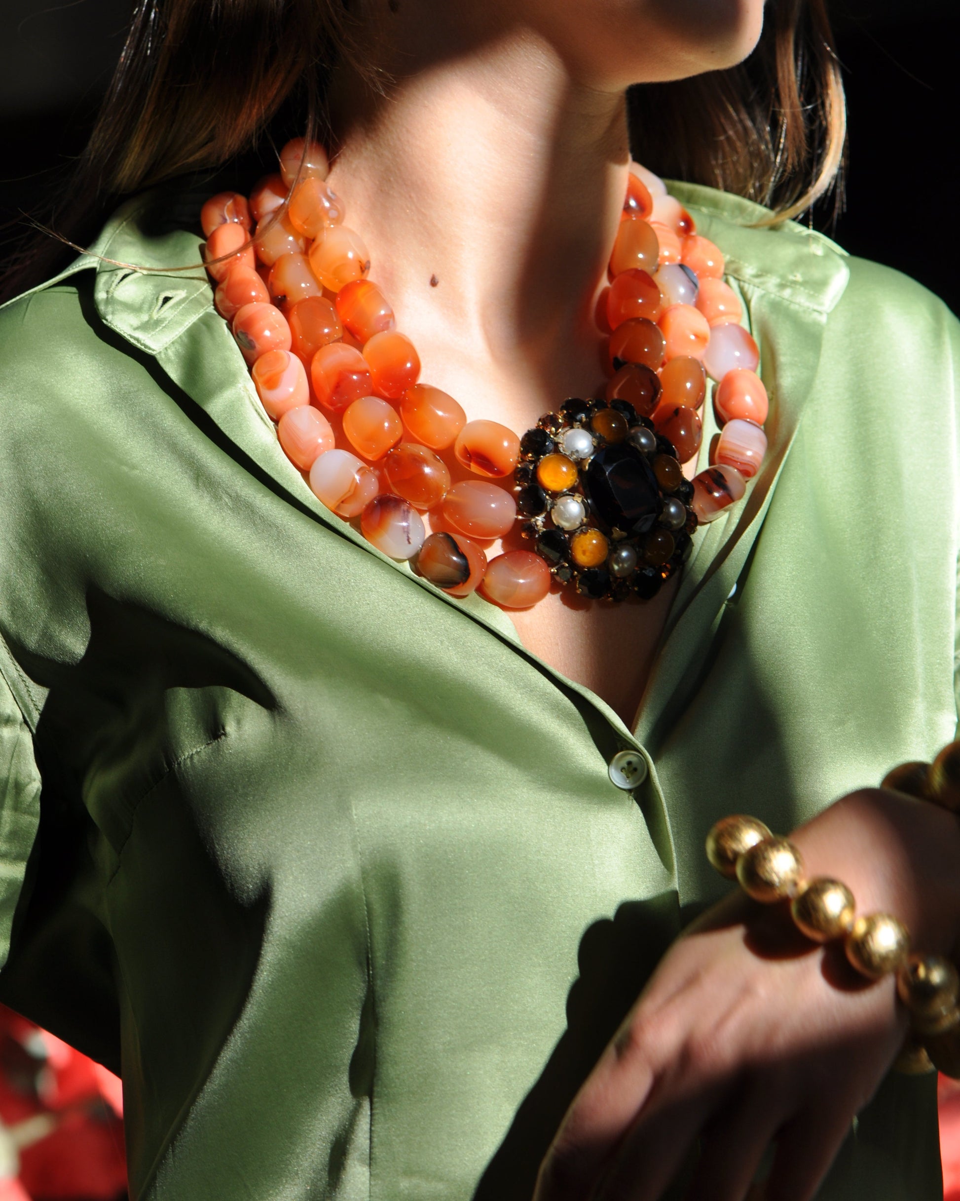 This necklace is one of a kind and comprises three strands of carnelian stones with round smokey quartz and pearls.