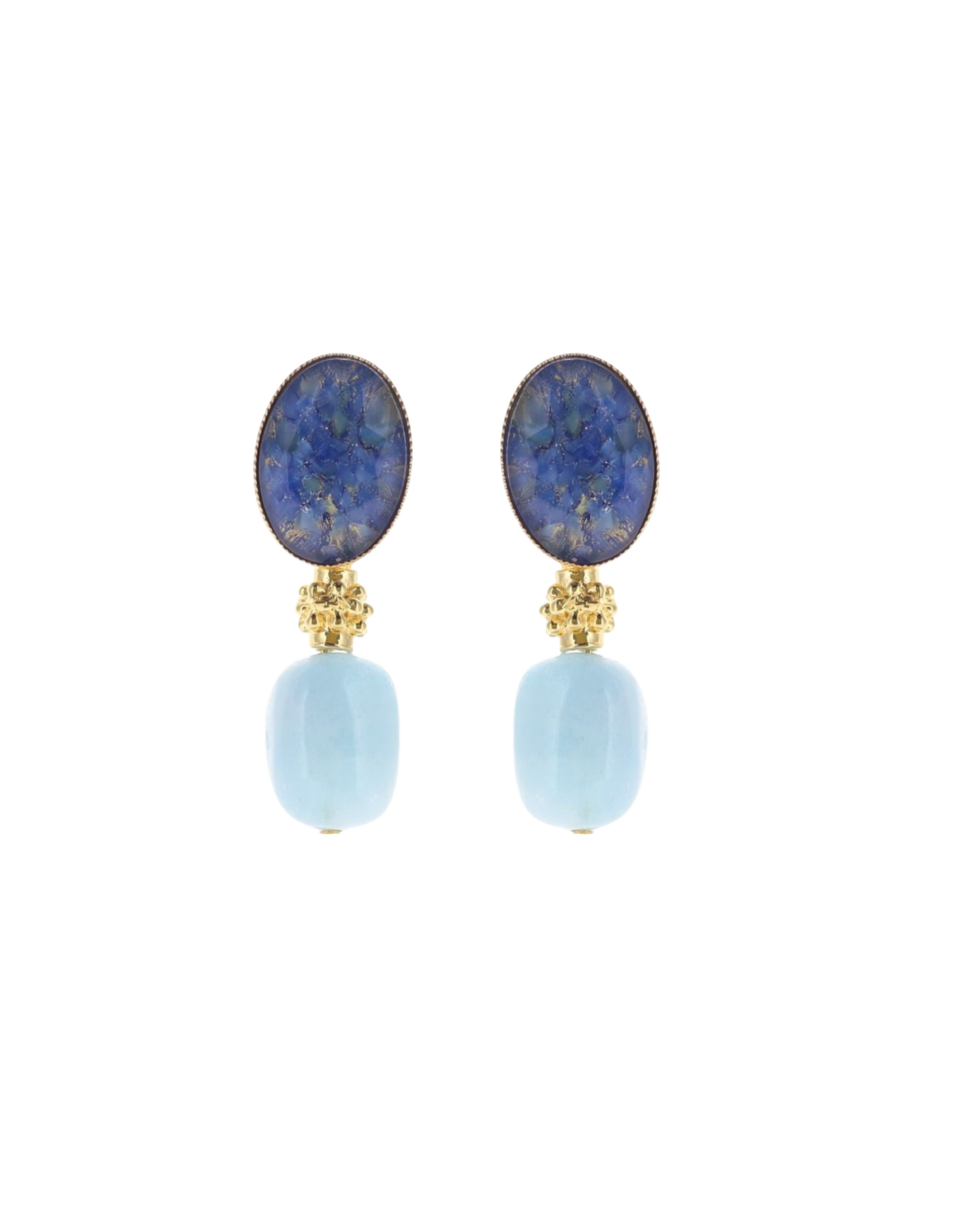 The Abigail earrings by Laurence Coste are made of baby blue and gold Venetian glass tops and Aquamarine stone drops. Aquamarine is associated with Pisces and has long been a symbol of youth, health and hope. A perfect birthstone for March, the Aquamarine creates a beautiful accent to spring and summer wardrobes.