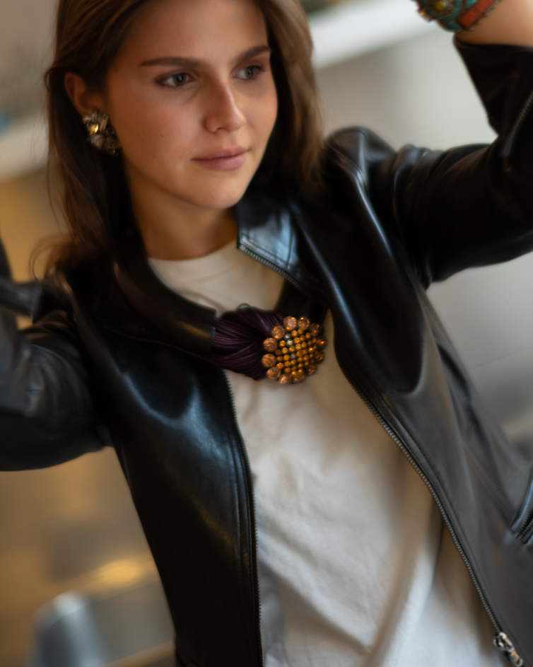 Our bold Auburn necklace combines a stunning ebony wood collar with a spectacular purple leather knot & Vintage Amber stones brooch Center, giving you the coolest look of the season!