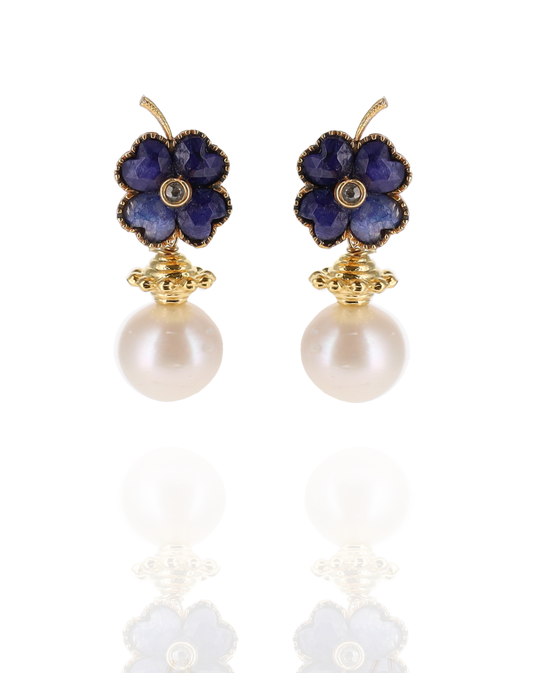 The Mila earrings pair a luminous freshwater pearl with a hand-carved jadeite or lapis flower top. A delicate balance of colour and texture.