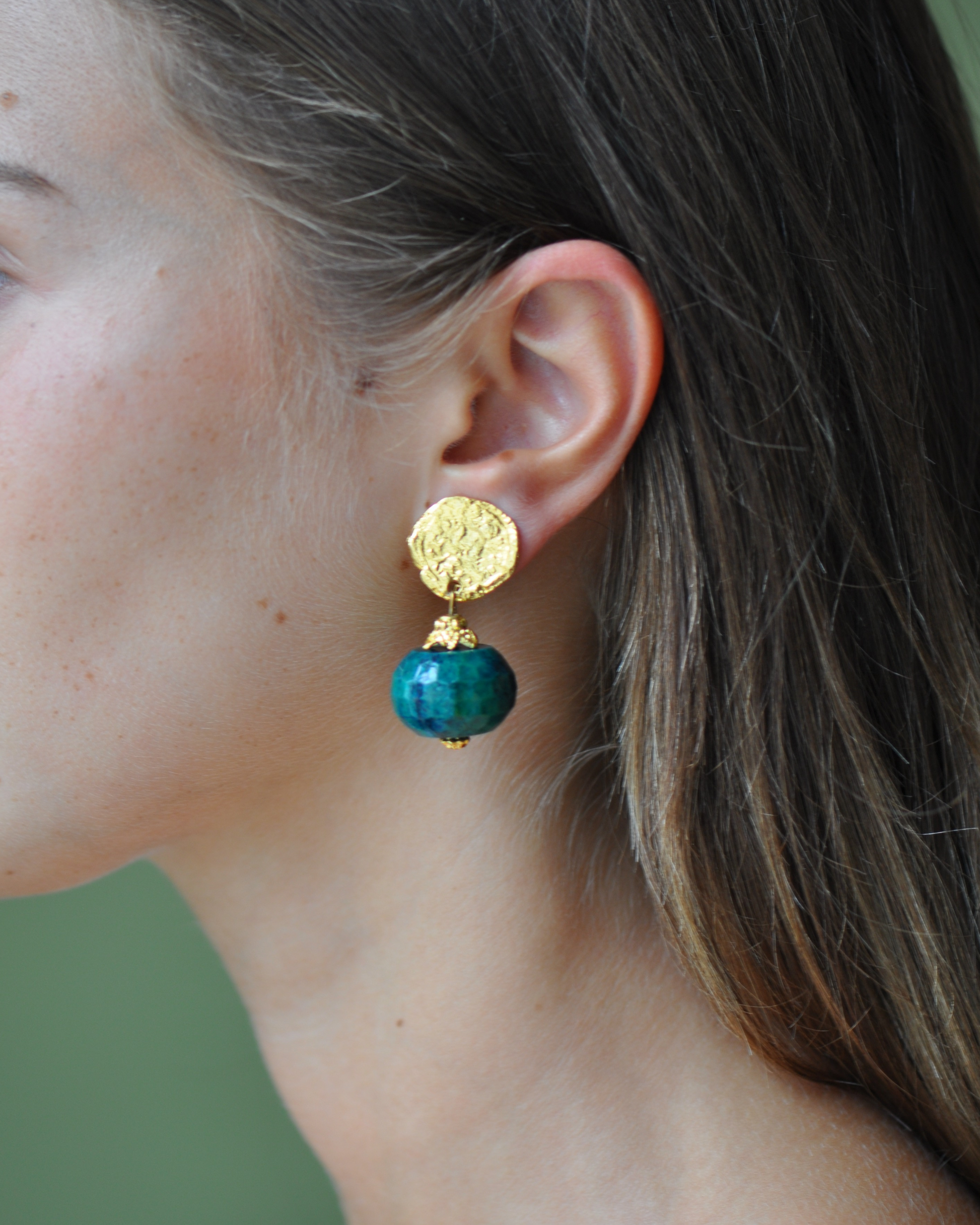 Tara Earrings feature faceted dark green agate drops paired with our distinctive signature coin top. They are a fusion of earthy sophistication and unmistakable charm. Very light and easy to style with any outfit.