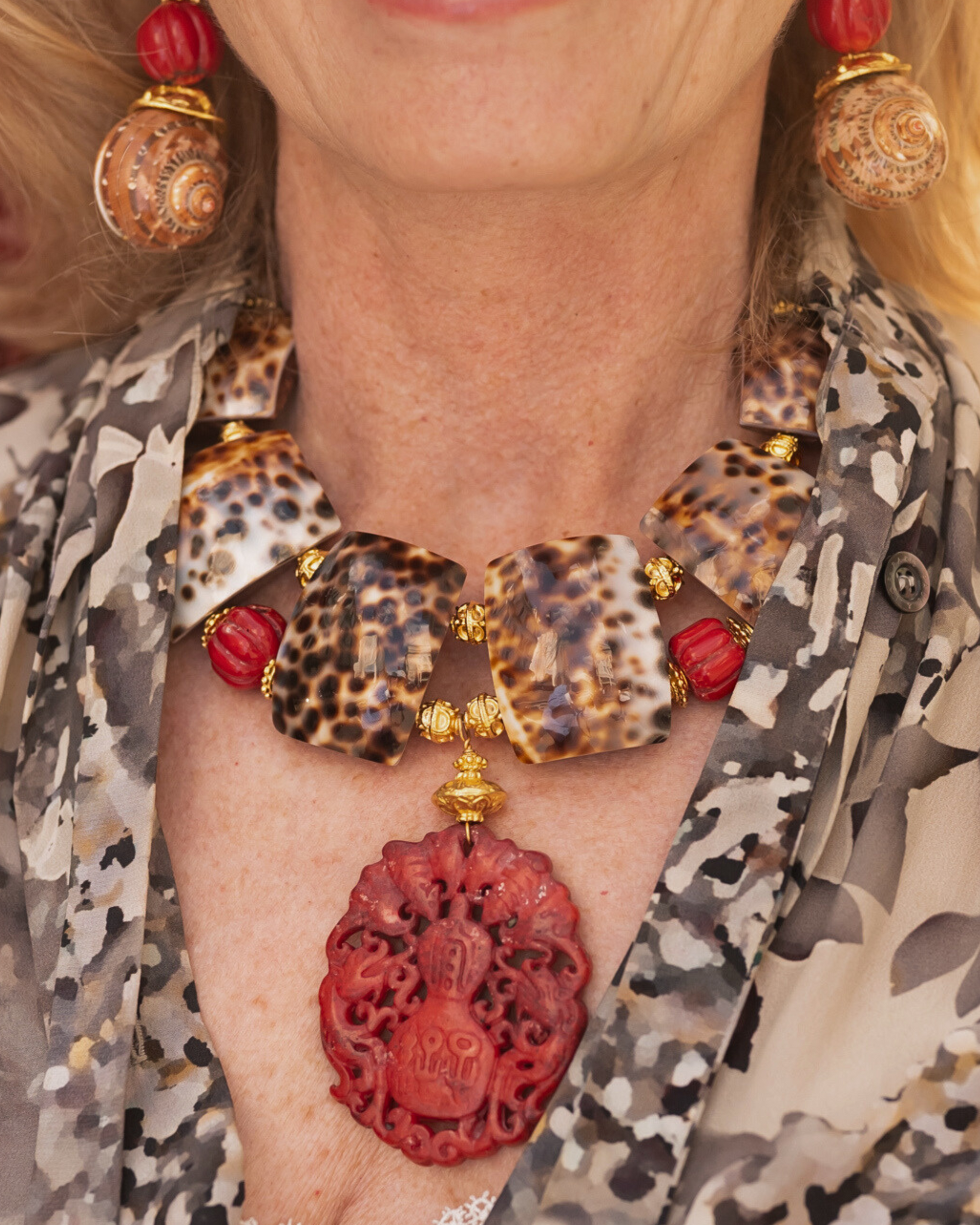 Tatum is a bold composition of carved stones, creating a grounded piece with sculptural balance. Accented with rich tones and a detailed central pendant.