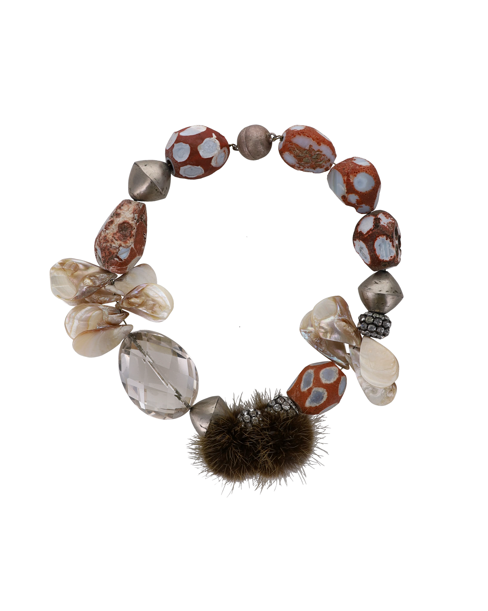 An earthy composition of polished stones, metallic beads, and shell-like forms, finished with soft textured accents. One of a kind and captivating, the Thorn Necklace is a statement piece with an intriguing, organic character.