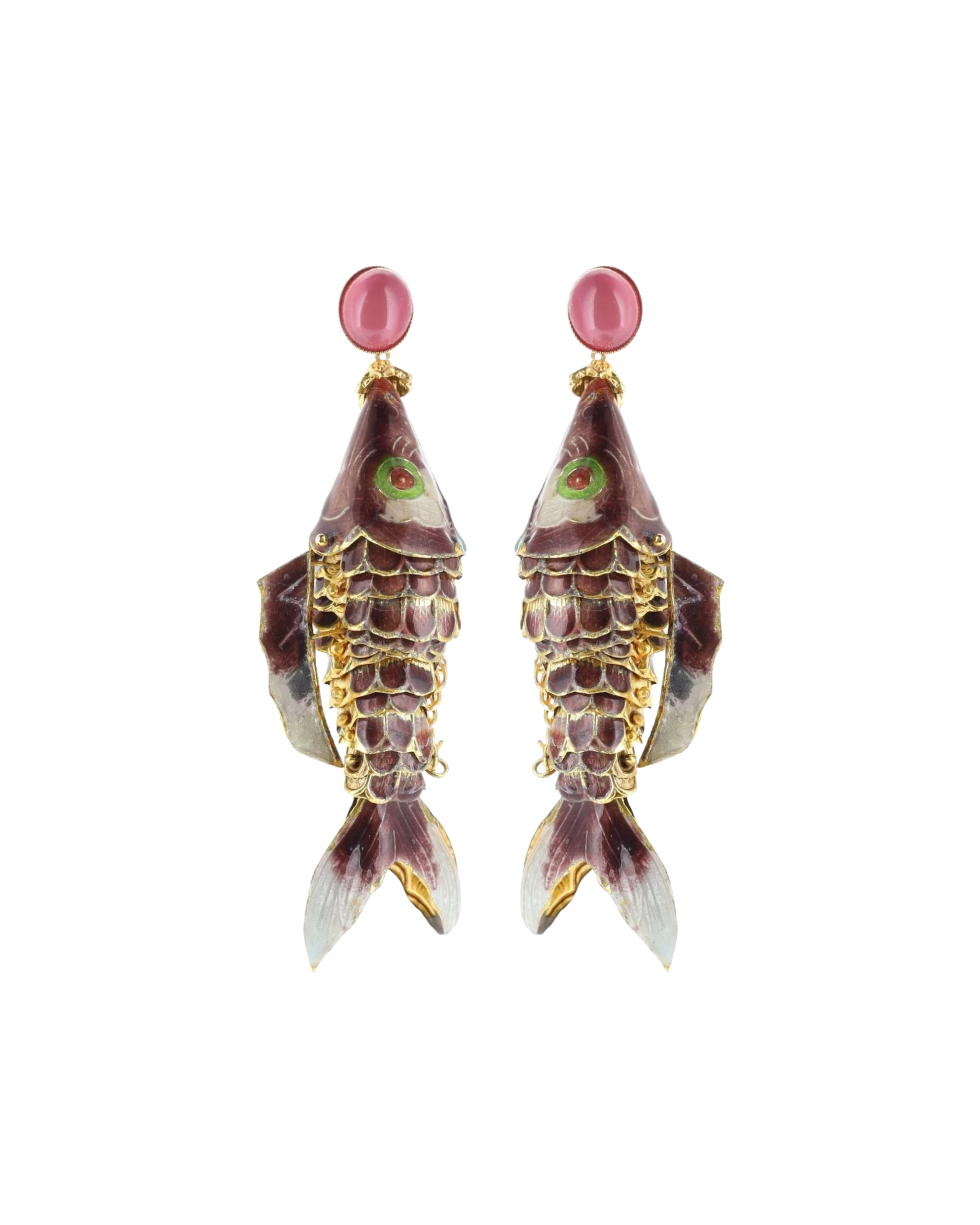 Hand-painted articulated fish earrings available in a variety of beautiful colours, with gold-plated detailing.