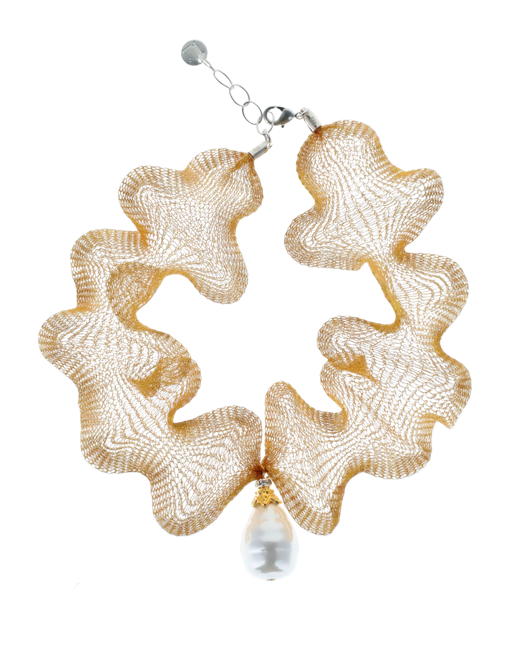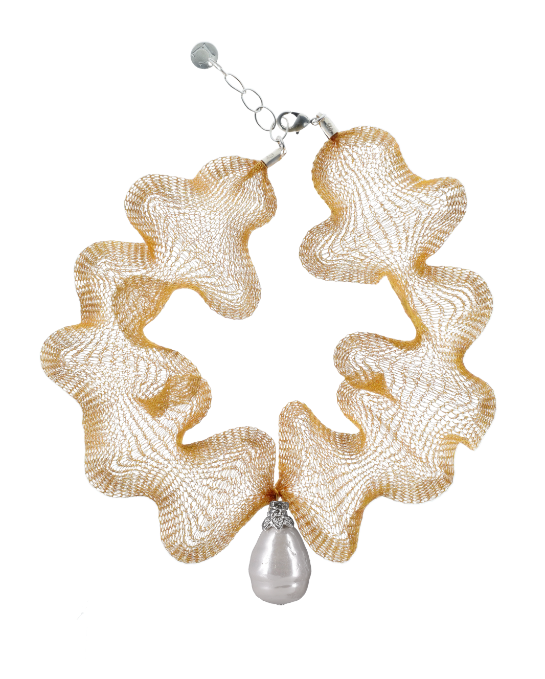 The Zenda choker features fluid coloured mesh framing a luminous handcrafted pearl pendant. Stretchy and adjustable, it molds effortlessly to the neck.